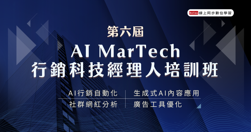 | 本課程邀請 AI MarTech策略各領域的專家講師,包含資深品牌顧問、電商營運、AI應用、數據分析、網紅行銷、廣告科技…等,實務分享如何突破傳統行銷框架,從數據、銷售、社群到內容,全方位分享AI MarTech應用,升級行銷科技經理人的實務技能。 |